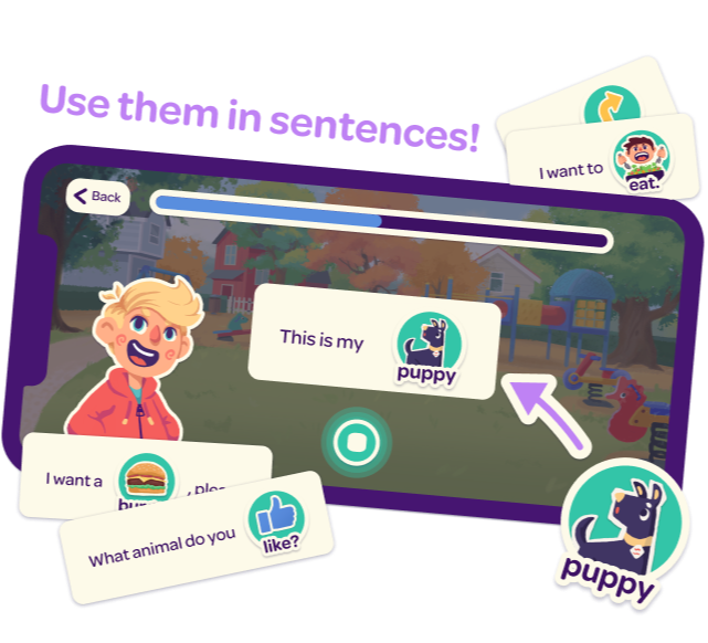 Each mission follows a simple path: your child learns useful words, practices putting them into full sentences, and then uses those sentences in a conversation. Guided by friendly characters, they build skills step by step—speaking out loud as they go. All content is safe, age-appropriate, and designed to support real communication.